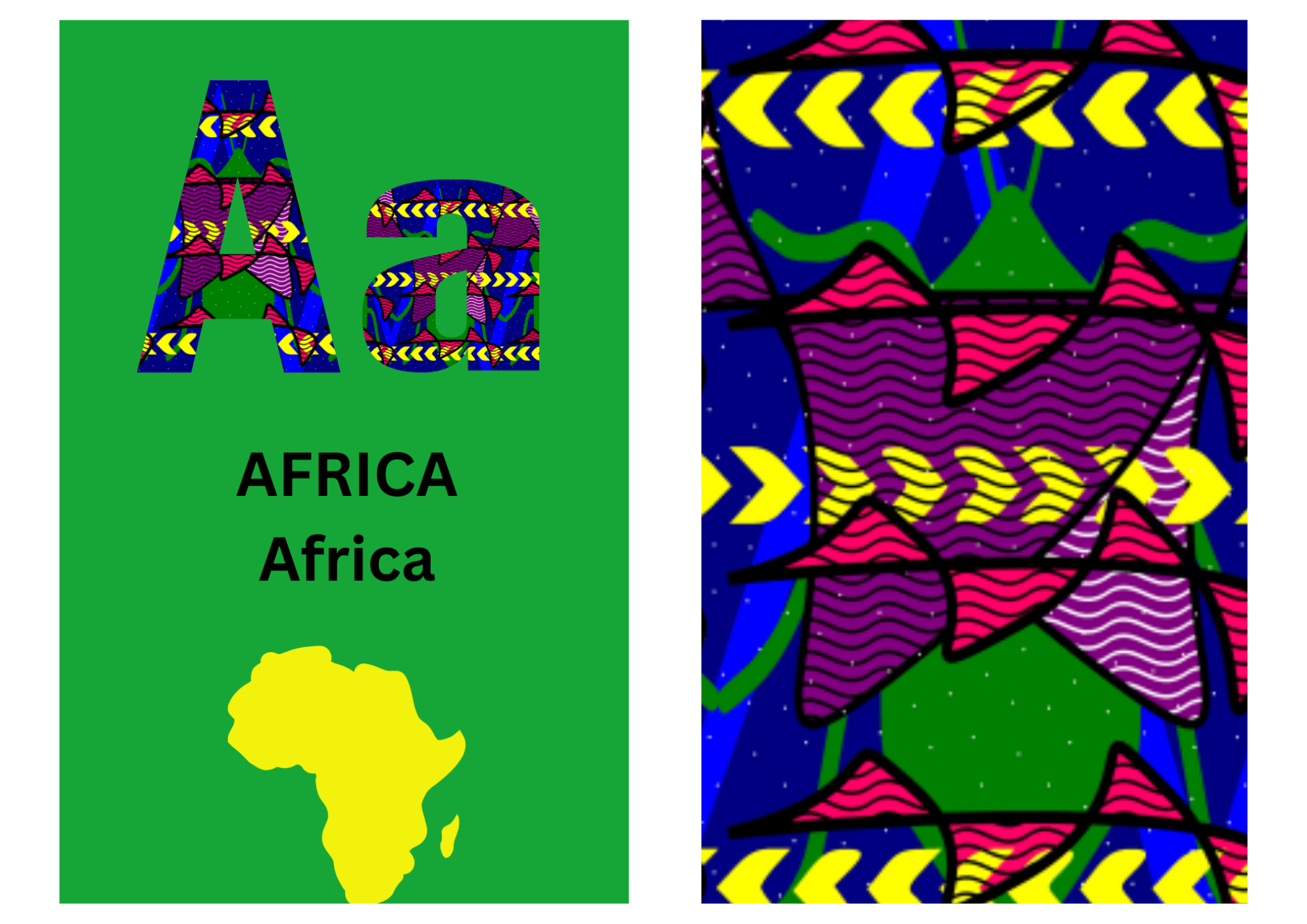 Bold letter A decorated with chevron patterns in blue, pink, and yellow, teaching African heritage.