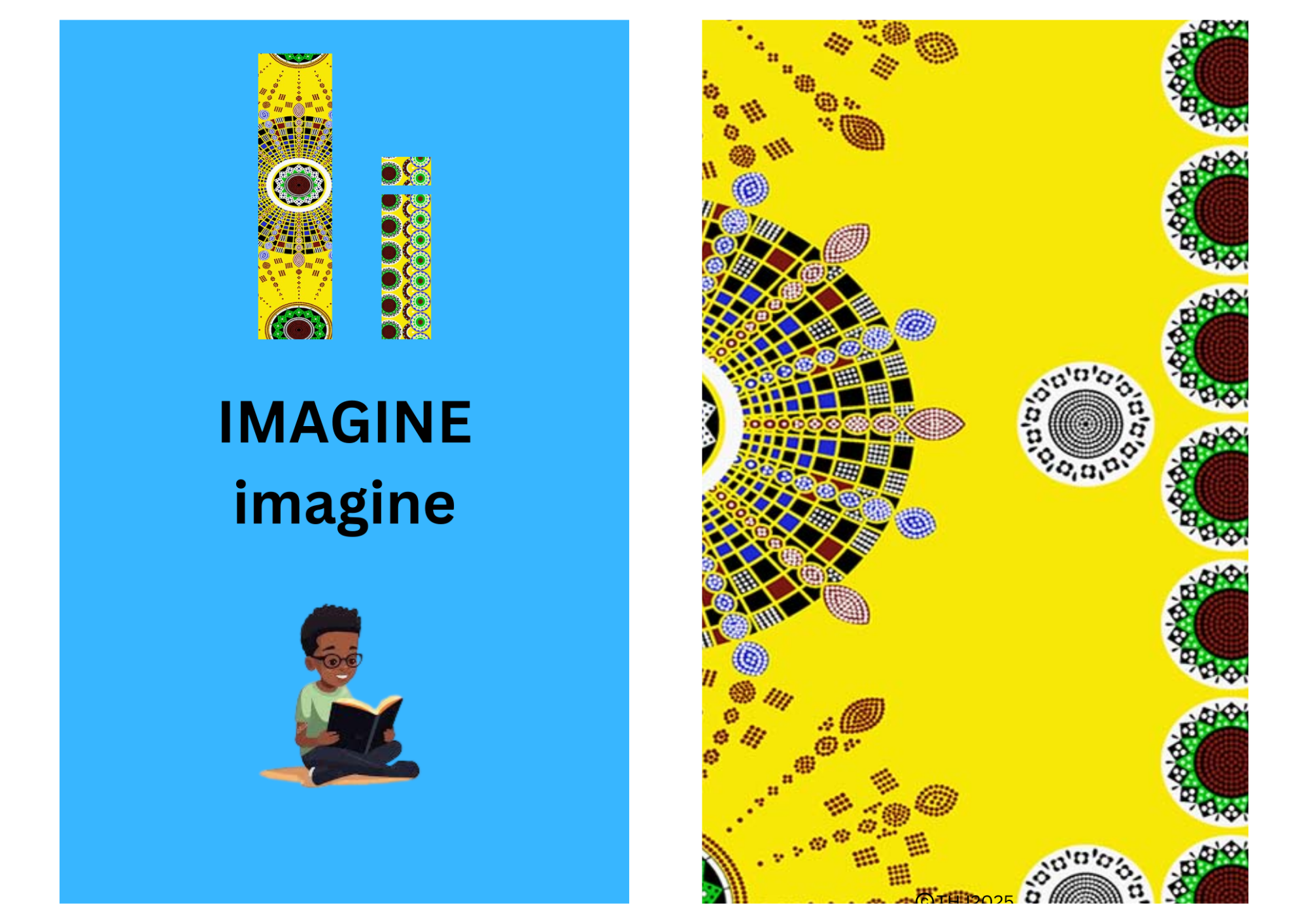 Letter I with sun-inspired patterns in yellow and green, showing a child reading.