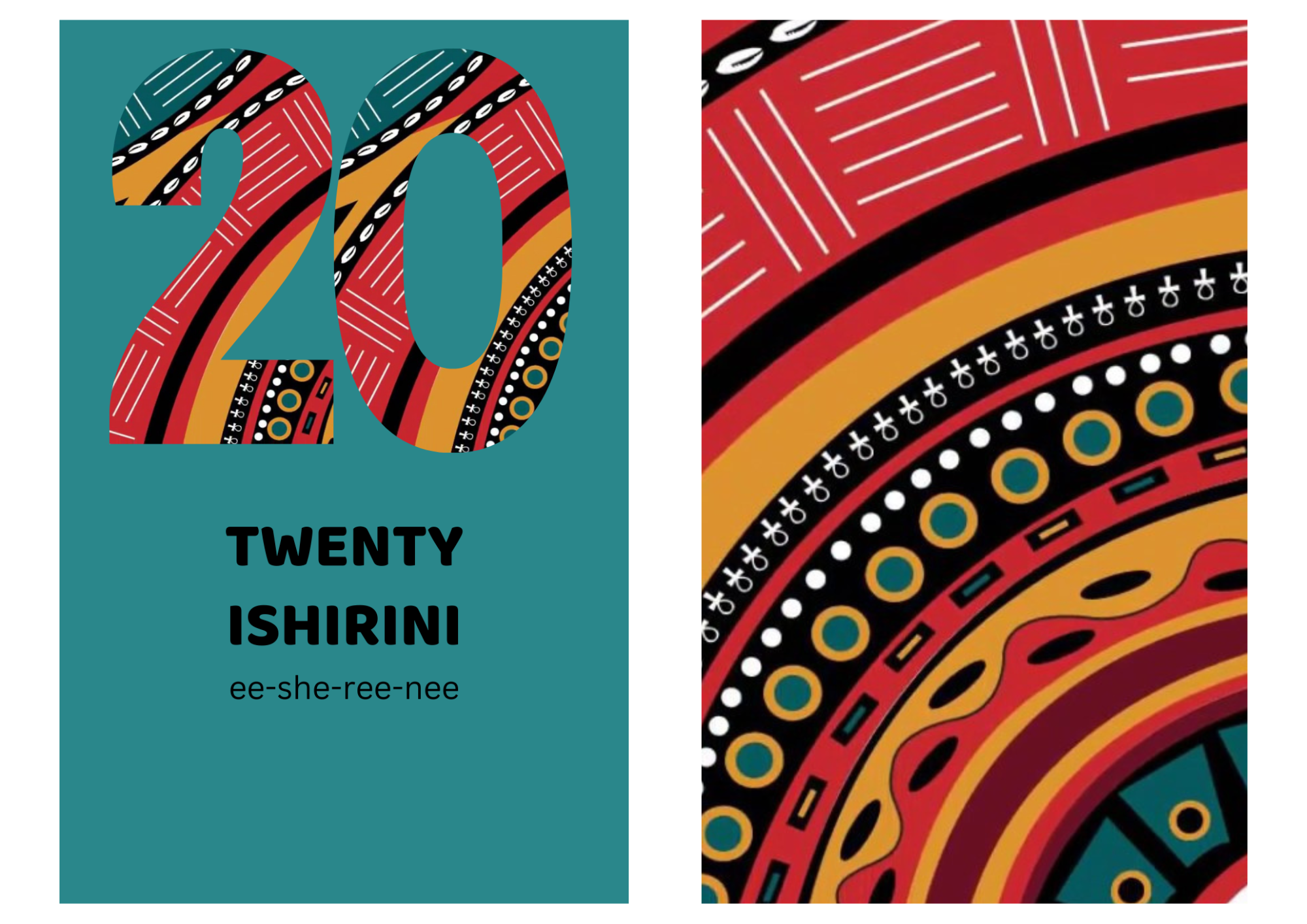 Number 20 with curved striped patterns in red, gold, and black on a teal background