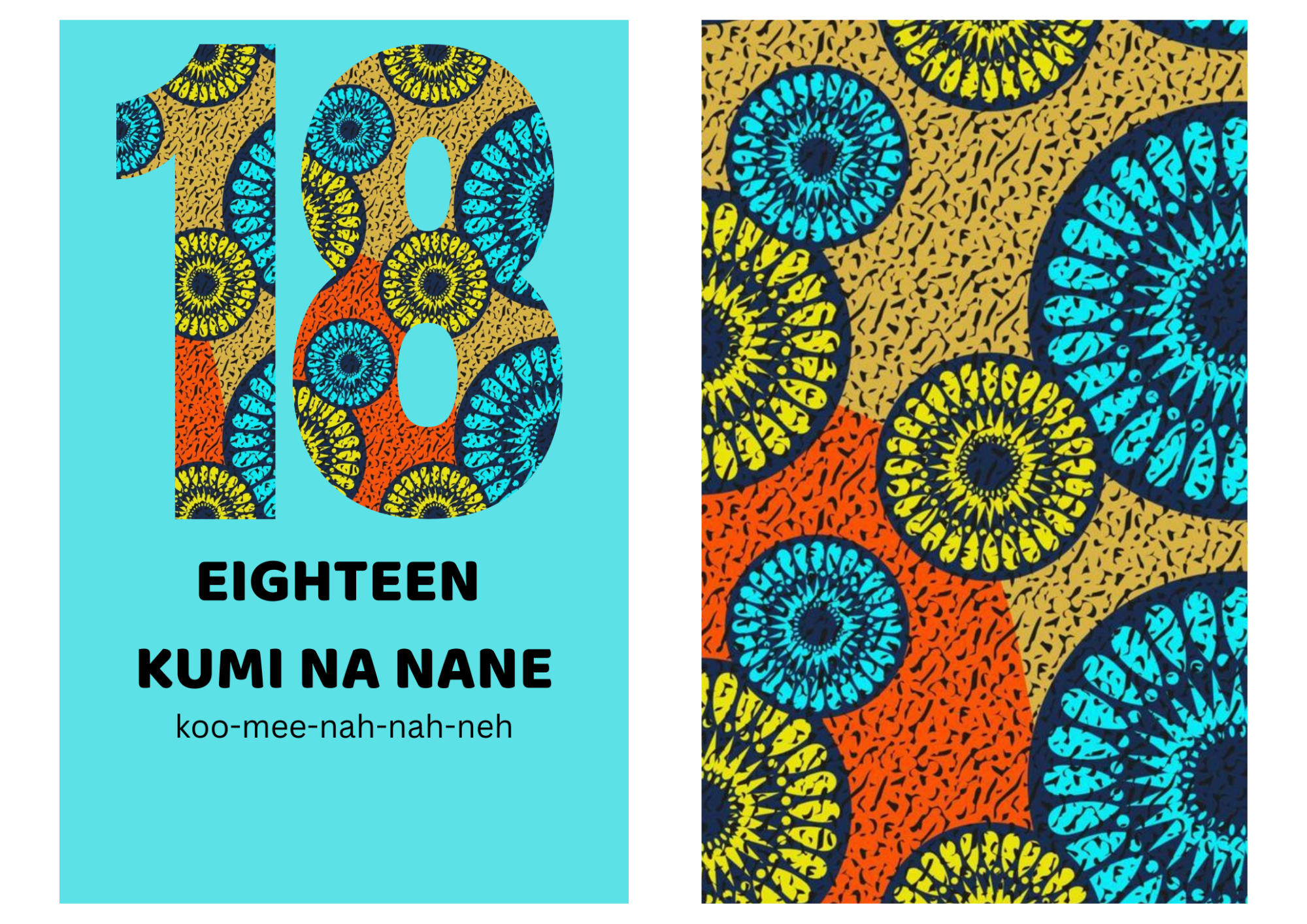 Number 18 with circular sunburst patterns in turquoise, orange, and yellow on a sky-blue background.