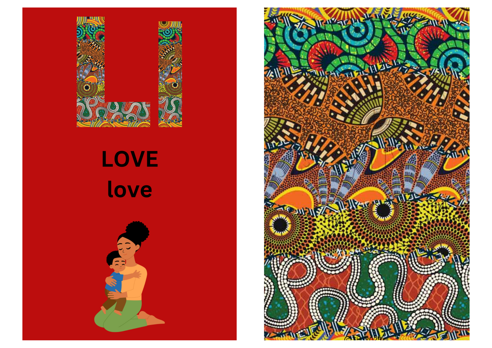Letter L with spiralling patterns in green and red, showing a tender parent-child embrace.