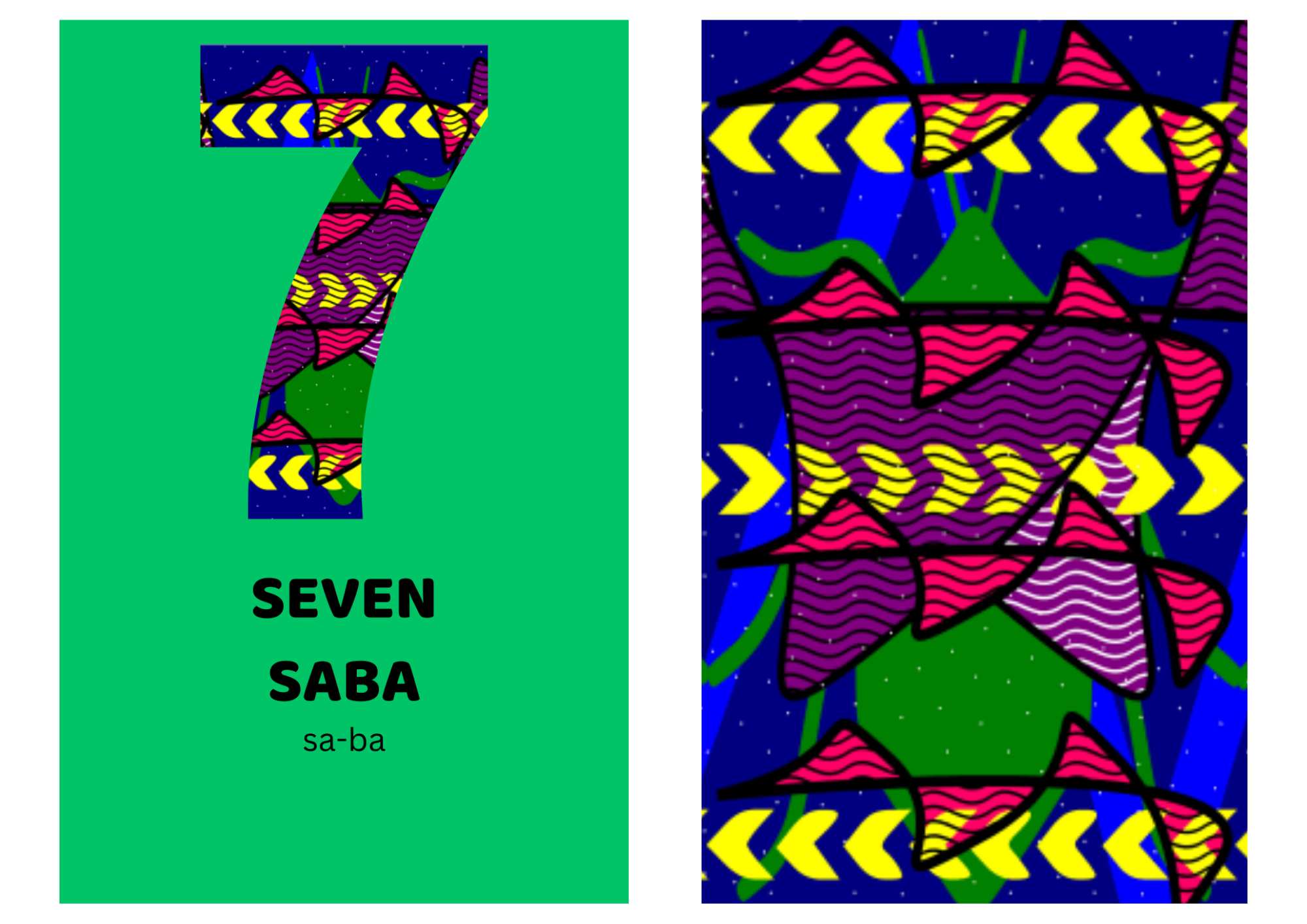 Number 7 with night sky patterns in pink, purple, and yellow on a green background.