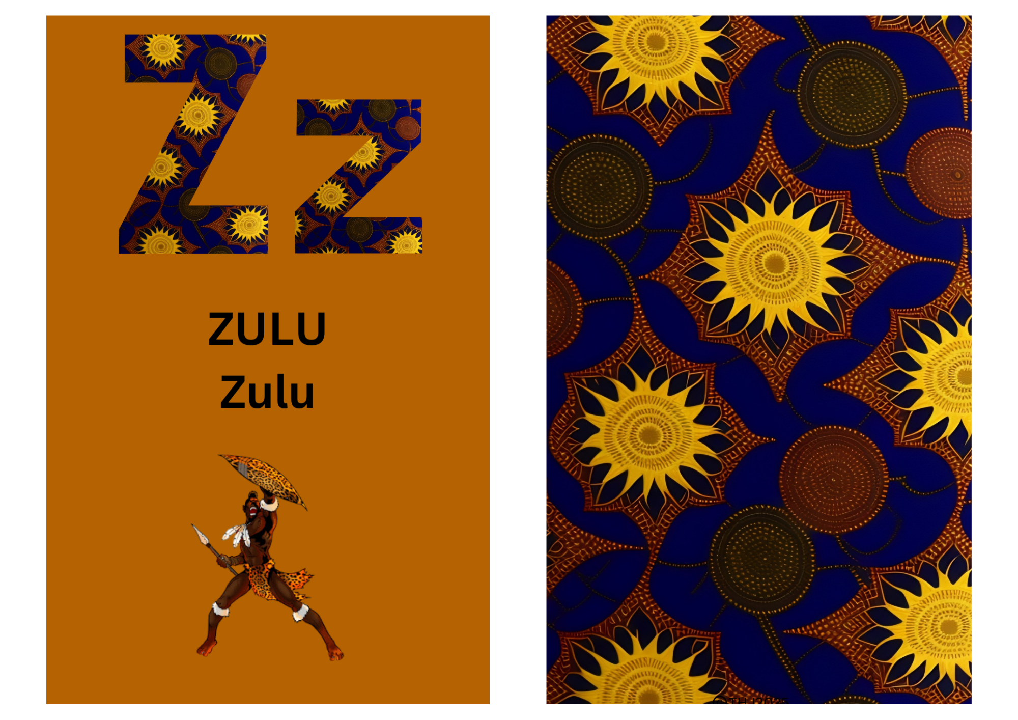 Letter Z with sun patterns in navy and gold, featuring traditional dancers.